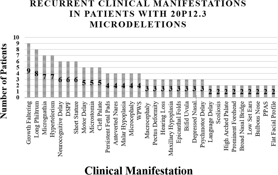 Figure 1. Major Clinical Findings Presented in Patients with 20p12.3 Microdeletions. Abbreviations: DSPF = down-slanting palpebral fissures, WPWS = Wolff–Parkinson–White syndrome, PPAS = peripheral pulmonary artery stenosis.