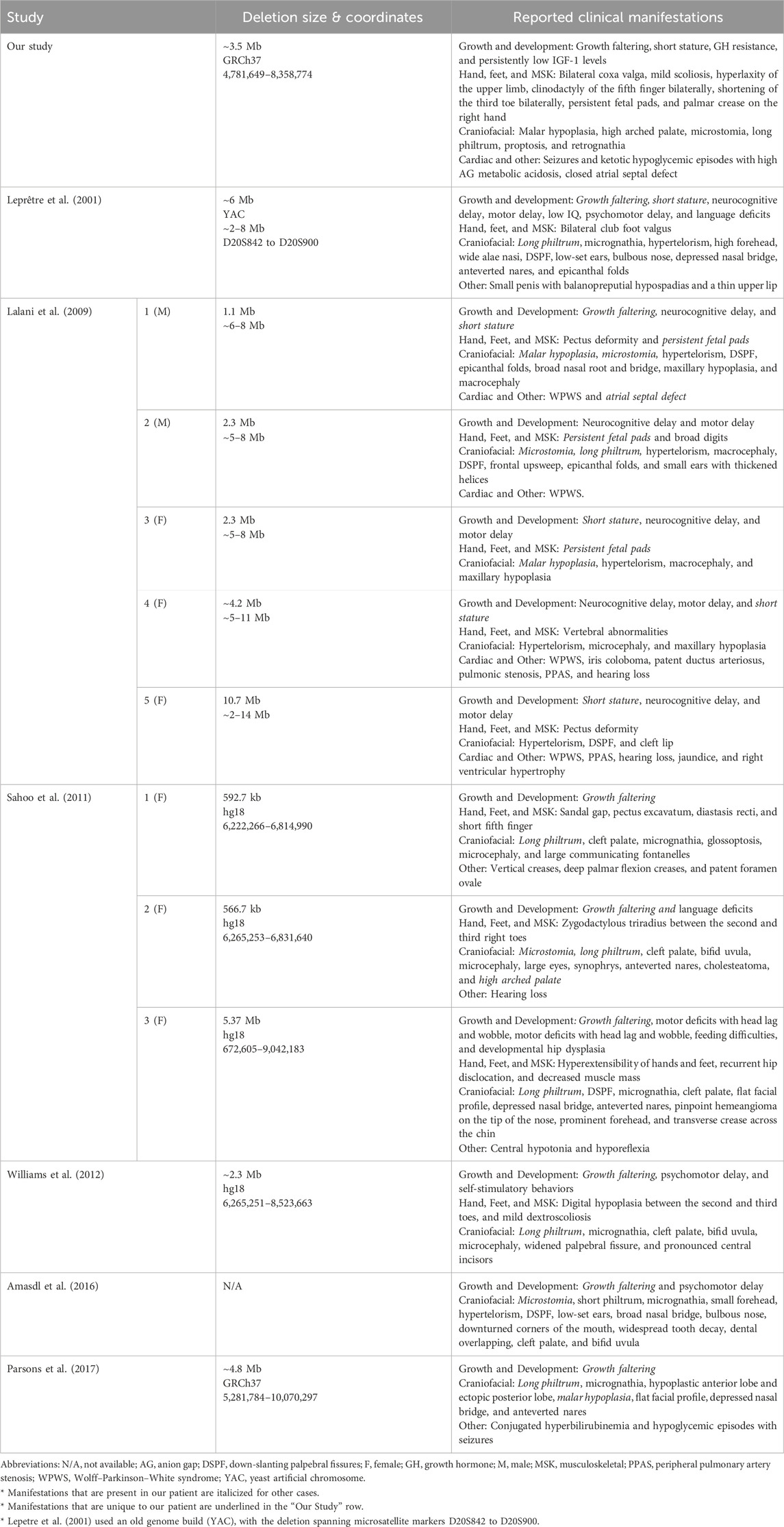 In conclusion, this case report contributes to the understanding of 20p12.3 microdeletion syndrome, highlighting its clinical heterogeneity and genetic complexity. Our patient presented with novel features, including episodes of ketotic hypoglycemia with high anion gap metabolic acidosis, GHI, persistently low IGF1 levels, malar hypoplasia, hyperlaxity of the upper limbs, clinodactyly of the fifth fingers bilaterally, a single palmar crease on the right hand, shortening of the third toes bilaterally, and severe hypoplasia of the left third toe. Together with previously reported features, these findings illustrate the broad phenotypic spectrum associated with 20p12.3 microdeletion syndrome. The variability in phenotype likely reflects variation in the size and genomic location of the deletion, reinforcing the importance of comprehensive clinical evaluation. This case report also emphasizes the critical role of CMA and WGS in establishing a definitive diagnosis, refining genotype–phenotype correlations, and guiding genetic counseling and management.