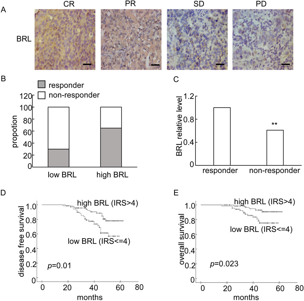 Figure 1. The expression of BRMS1L was correlated with neoadjuvant chemotherapy (NACT) response and prognosis of breast cancer patients. (A) Representative IHC of BRMS1L in breast tissues with different response to NACT. Scale bar corresponds to 50 mm. CR, complete response; PR, partial response; SD, stable disease; PD, progressed disease. (B) Percentage of pCR in patients stratified by BRMS1L expression. (C) The BRMS1L mRNA expression was measured using qRT-PCR in breast cancer tissues. (D, E) The Kaplan–Meier disease-free survival (DFS) and overall survival (OS) curves of patients with low (IR S≤ 4) and high (IRS > 4) BRMS1L levels, with a median follow-up period of 45 months. BRL, BRMS1L. Non-responders vs. responders, **p < 0.01.