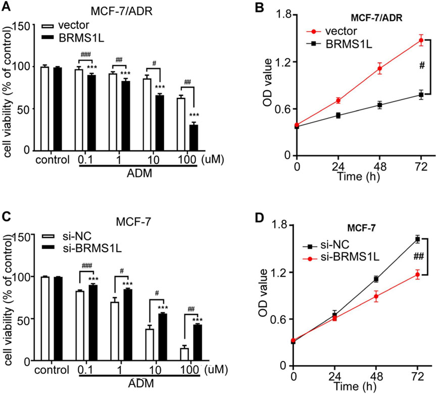 Figure 2. BRMS1L promotes chemosensitivity in breast cancer cells. (A, C) Cell viability was determined under treatment of different concentrations of ADM in MCF-7/ADR and MCF-7 cells. (B, D) Cell viability was determined after 24 h, 48 h, or 72 h in MCF-7/ADR and MCF-7 cells using CCK-8 assays. ADM vs. control; ***, p < 0.001. BRMS1L vs. vector, ###, p < 0.001; ##, p < 0.01; #, p < 0.05.