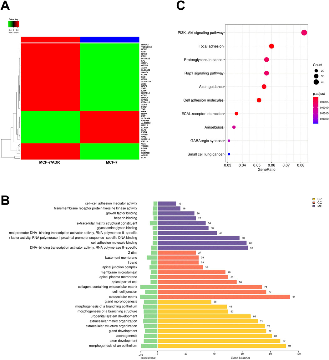 Figure 3. Autophagy is associated with chemotherapy resistance in breast cancer cells. (A) A heatmap shows the RNA sequencing analysis of MCF-7 and MCF-7/ADR cells with DE mRNAs. The gene signatures (top 50) are indicated in the right panel. (B) GO enrichment analysis (top 10) of DE mRNAs. Yellow represents biological process (BP), red represents cellular component (CC), and purple represents molecular function (MF). (C) KEGG pathway analysis (top 10) of DE mRNAs.