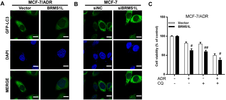 Figure 4. BRMS1L inhibits Adriamycin-induced autophagy in breast cancer cells. (A,B) Immunofluorescent staining of LC3 in MCF-7/ADR and MCF-7 cells. (C) Cell viability was measured with or without treatment of Adriamycin or CQ in MCF-7/ADR cells. BRMS1L vs. vector, ###, p < 0.001; #, p < 0.05.