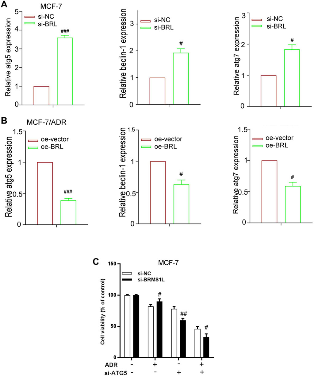 Figure 5. BRMS1L inhibits autophagy via downregulation of ATG5. (A,B) Expression levels of ATG5, ATG7, and Beclin-1 were measured using qRT-PCR in MCF-7/ADR and MCF-7 cells that were treated with the pcDNA3 vector carrying BRMS1L or si-BRMS1L, along with their controls. (C) Cell viability was determined in MCF-7 cells that were co-transfected with BRMS1L-siRNA and ATG5-siRNA. Si-BRMS1L vs. si-NC, oe-vector vs. oe-BRMS1L, ###, p < 0.001; ##, p < 0.01; #, p < 0.05. si-NC, negative control; si-BRMS1L, BRMS1L-siRNA; oe-vector, vector; oe-BRMS1L, BRMS1L; si-ATG5, ATG5-siRNA.