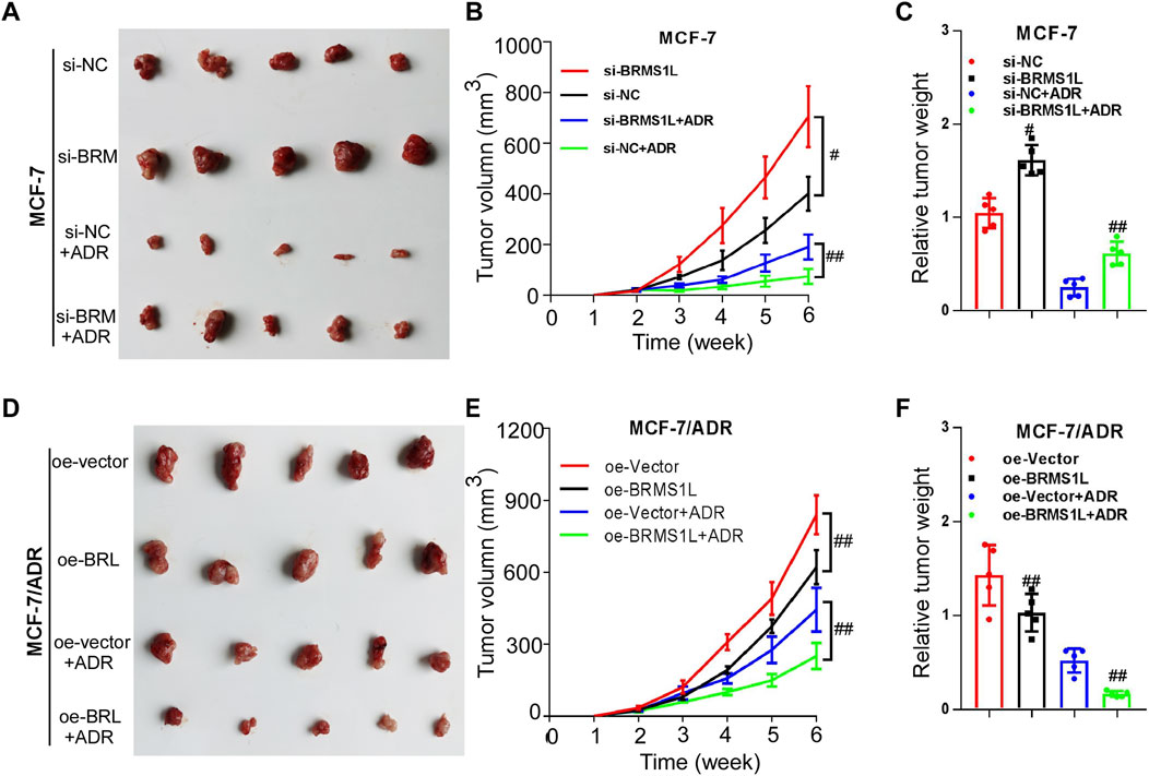 Figure 6. BRMS1L enhances chemotherapy sensitivity in vivo. (A–C) Silencing BRMS1L dramatically promoted the growth of breast xenograft tumors upon Adriamycin treatment. (D–F) Overexpression of BRMS1L significantly inhibited the growth of breast cancer xenograft tumors upon Adriamycin treatment. Si-BRMS1L vs. si-NC, oe-vector vs. oe-BRMS1L, Si-BRMS1L+ADR vs. si-NC+ADR, oe-vector+ADR vs. oe-BRMS1L+ADR; ##, p < 0.01; #, p < 0.05.