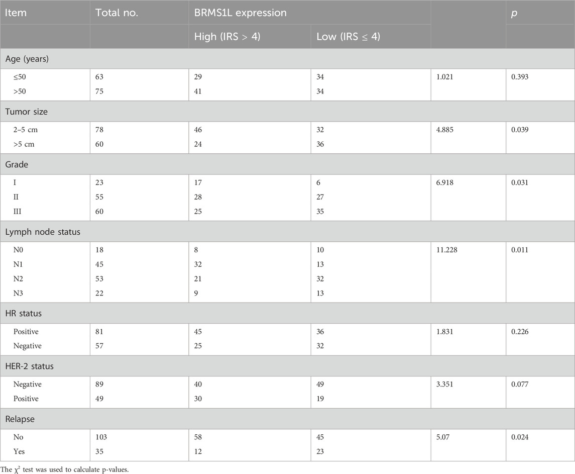 Table 1. Association between BRMS1L expression and clinicopathologic features of 138 breast cancer patients [No (%)].