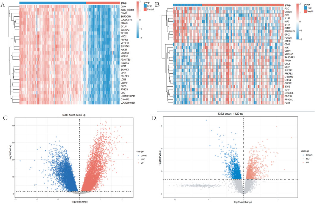 In the CHD dataset GSE113079, a total of 12,968 DEGs were identified, including 6,660 upregulated DEGs and 6,308 downregulated DEGs. In the T2D dataset GSE41762, a total of 52,461 DEGs were identified, including 11,129 upregulated DEGs and 13,332 downregulated DEGs. The heatmaps (Figures 1A,B) display the top 30 most significant DEGs for both diseases, while the volcano plots (Figures 1C,D) illustrate the expression patterns of the DEGs in both diseases.