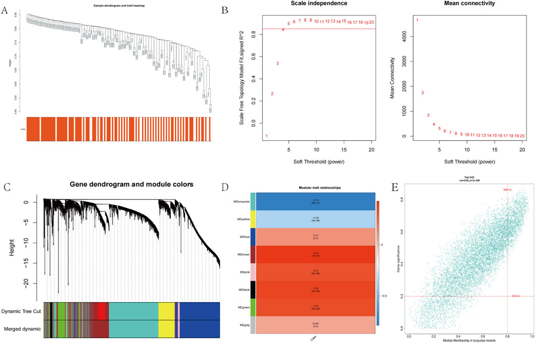 No outliers were detected in the 141 samples from the GSE113079 dataset (Figure 2A). To construct a scale-free network (R2 = 0.85), we set the soft-thresholding power β to 5 (Figure 2B). Using a hybrid dynamic tree-cutting algorithm with a minimum module size of 100 genes, 10 co-expression modules were initially identified, including the gray module containing unassigned genes (Figure 2C). Subsequently, modules exhibiting high similarity (with a module eigengene dissimilarity threshold, MEDissThres = 0.2) were merged, resulting in a final set of 8 distinct modules (Figure 2C). Pearson correlation analysis revealed that the MEturquoise module showed the strongest significant association with the CHD phenotype (cor = −0.79, P = 6e-31) (Figure 2D). Furthermore, within the MEturquoise module, MM and gene GS for CHD displayed a remarkably strong correlation (cor = 0.85, P = 1e-200) (Figure 2E). Based on these findings, the MEturquoise module was designated as the module of interest (termed the CHD module), and the 6,914 genes it contained were defined as CHD module genes.