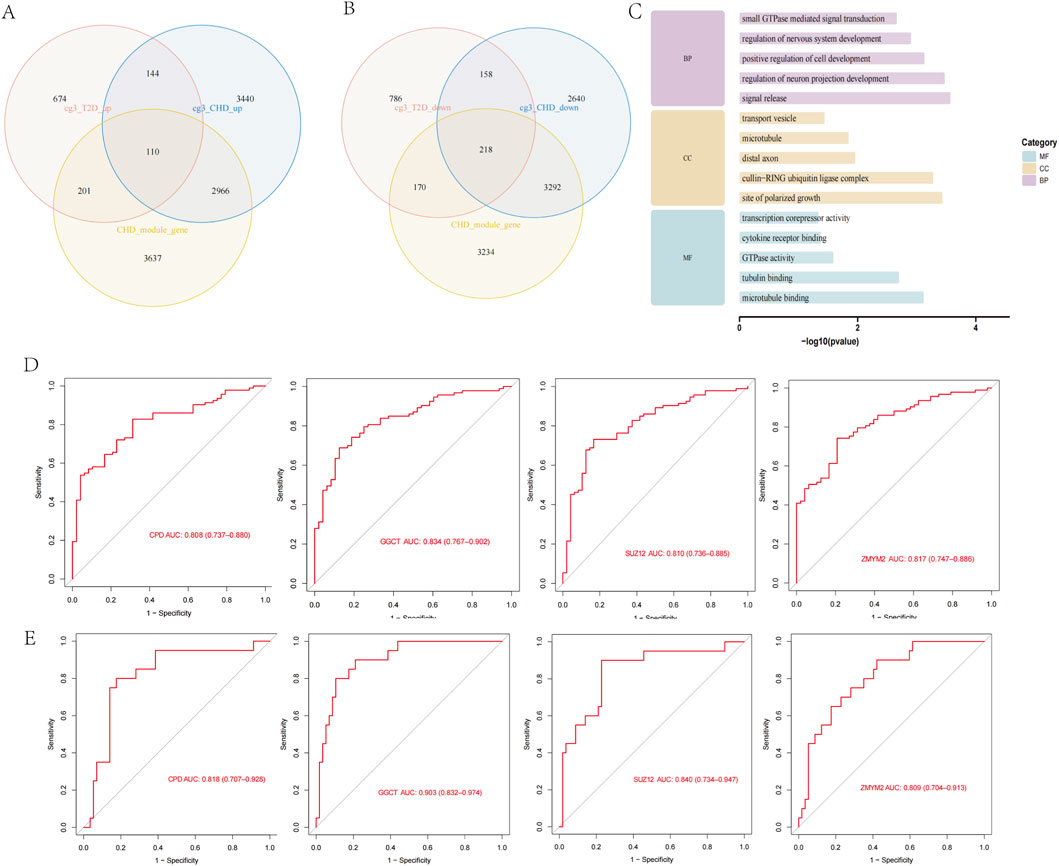 We intersected the 12,968 CHD DEGs, 6,914 CHD MEturquoise module genes, and 2,461 diabetes DEGs to identify shared genes between both diseases. The results revealed 110 overlapping genes in the upregulated set (Figure 3A) and 218 overlapping genes in the downregulated set (Figure 3B), with expression patterns of these 328 shared genes visualized in a heatmap across both disease cohorts (Supplementary Figure S1). We performed GO enrichment analysis on the 328 shared genes for both diseases to explore common regulatory pathways. The GO analysis indicated that these shared genes may be associated with specific biological processes such as positive regulation of nervous system development, positive regulation of neurogenesis, and positive regulation of cellular development (Figure 3C). We evaluated the diagnostic potential of the 328 shared genes by performing ROC curve analysis to assess their ability to discriminate between control and CHD samples, as well as between control and T2D samples. Genes with AUC values > 0.8 in both diseases were considered diagnostically significant. This analysis identified four genes (CPD, GGCT, SUZ12, ZMYM2) meeting this threshold, which were subsequently designated as diagnostic biomarkers (Figures 3D,E).