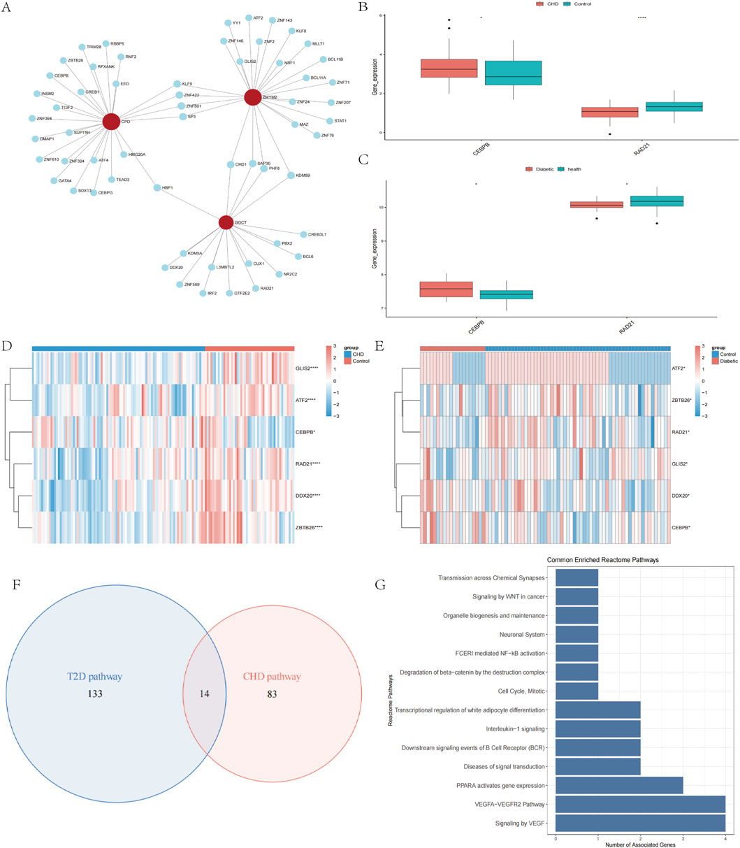Figure 4. Regulatory networks and functional pathways of cross-disease biomarkers. (A) Prediction of TFs for Diagnostic Biomarkers. (B,C) Box plots of transcription factors CEBPB and RAD21 expression in CHD, T2D and normal controls. (D,E) Heatmap of TFs expression in CHD, T2D, and normal controls. (F) Venn diagram screening of co-enriched pathways in CHD and T2D. (G) Visualization of 14 co-enriched pathways. *P < 0.05, **P < 0.01, ***P < 0.001.