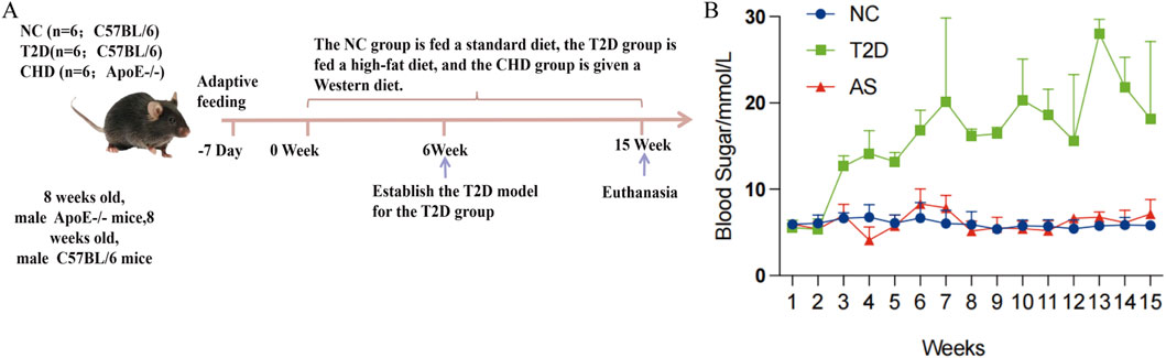 The T2D model was established in C57BL/6 mice using a modified protocol (Wang et al., 2012). Mice received a high-fat diet (HFD) for 6 weeks to induce insulin resistance, followed by a single intraperitoneal streptozotocin injection (STZ, 75 mg/kg). Diabetes was confirmed by two consecutive fasting blood glucose (FBG) measurements >11.1 mmol/L. The CHD group received a Western-type diet (21% fat, 34% sucrose, 19.5% casein, 0.2% cholesterol; Envigo) for 12 weeks. The NC group was administered sodium citrate buffer injections and maintained on standard chow diet. Body weight and blood glucose were monitored weekly in all mice throughout the 15-week experimental period (weeks 0–15). At the end of the diet protocol, the animals were humanely euthanized using 80 mg/kg ketamine–10 mg/kg xylazine. In our study, aortic arch and aortic root dissection were performed.