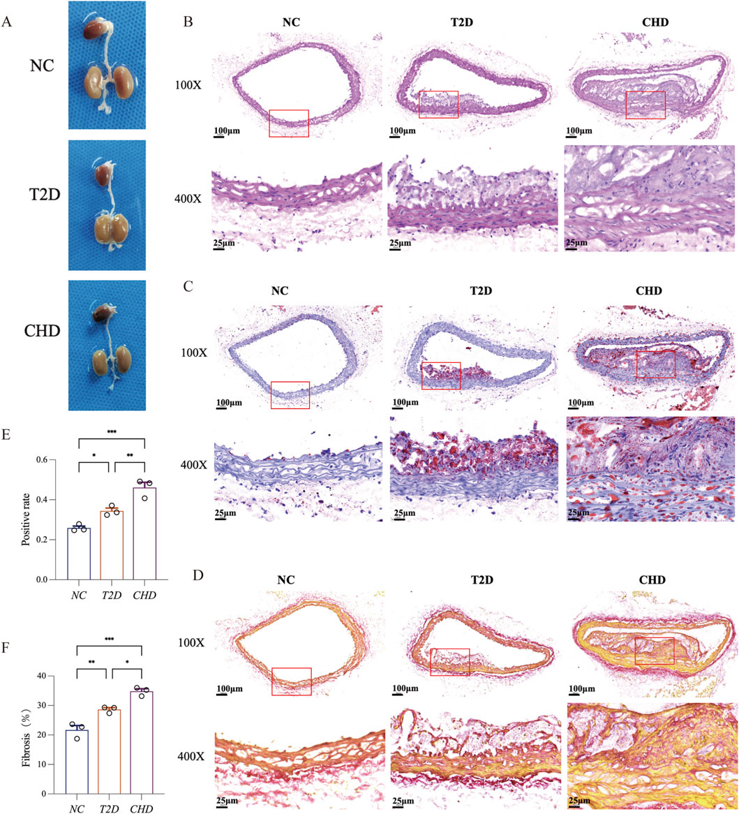 Figure 6. Comparative histopathology of aortic vessels in T2D, CHD and normal mice. (A) Representative aortic samples from CHD, T2D, and normal control mice. (B) H&E staining of mouse aortic sections. (C) Oil Red O staining of mouse aortic sections. (D) Sirius Red staining of mouse aortic sections. (E) Quantitative analysis of Oil Red O positive area in aortic lesions. (F) Quantitative analysis of Sirius Red positive area in aortic lesions (n = 3 per group). The data are represented as means ± s.e.m. *P < 0.05, **P < 0.01, ***P < 0.001.