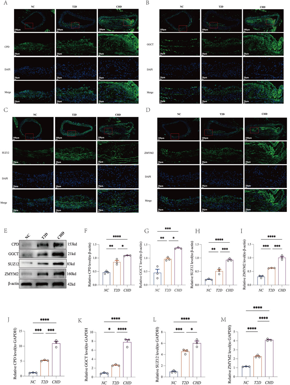 Figure 7. Four shared diagnostic biomarkers exhibit consistent upregulation in both CHD and T2D. (A–D) Immunofluorescence of CPD, GGCT, SUZ12, and ZMYM2 in mouse aortic tissues. (E–I) Representative Western blot of CPD, GGCT, SUZ12, ZMYM2, and β-actin in mouse aortic tissues with quantification analysis (n = 3 per group). (J–M) RT-qPCR analysis of CPD, GGCT, SUZ12, and ZMYM2 in mouse aortic tissues (n = 3 per group). The data are represented as means ± s.e.m. *P < 0.05, **P < 0.01, ***P < 0.001.
