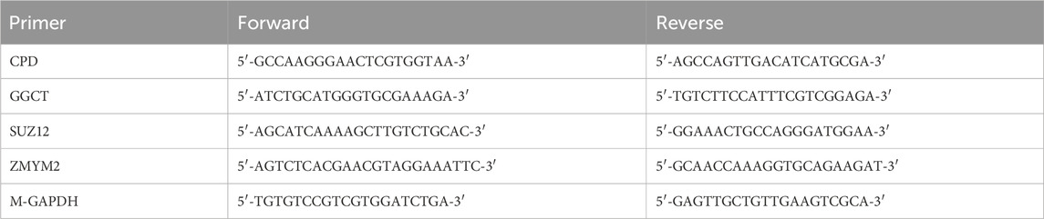 An additional set of sections underwent immunofluorescence staining using the following primary antibodies as required: GGCT (bs-13346R, Bioss, China), CPD (DF9339, Affinity, China), ZMYM2 (bs-13603R, Bioss, China), and SUZ12 (R381543, Zenbio, China); post-staining imaging was performed using a laser scanning confocal microscope (Olympus, Japan).