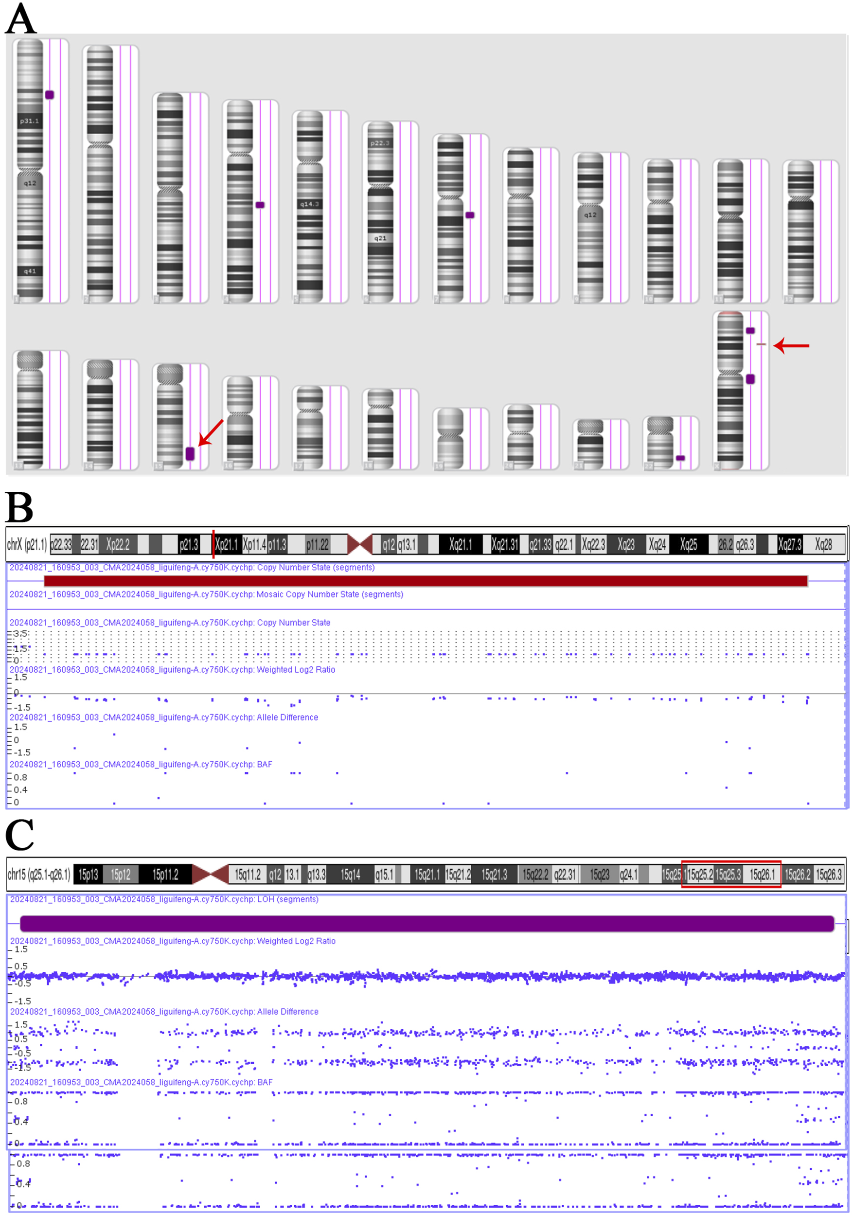 CNV and ROH results in Affymetrix CytoScan 750K CMA. (A) Chromosome results. (B) Hemizygote deletion pathogenic CNV on Xp21.1, range 31,784,724–32,057,482, fragment length 272.8 kb. (C) ROH on 15q25.1q26.1, range 81,006,170–94,168,517, fragment length 13.2 Mb.