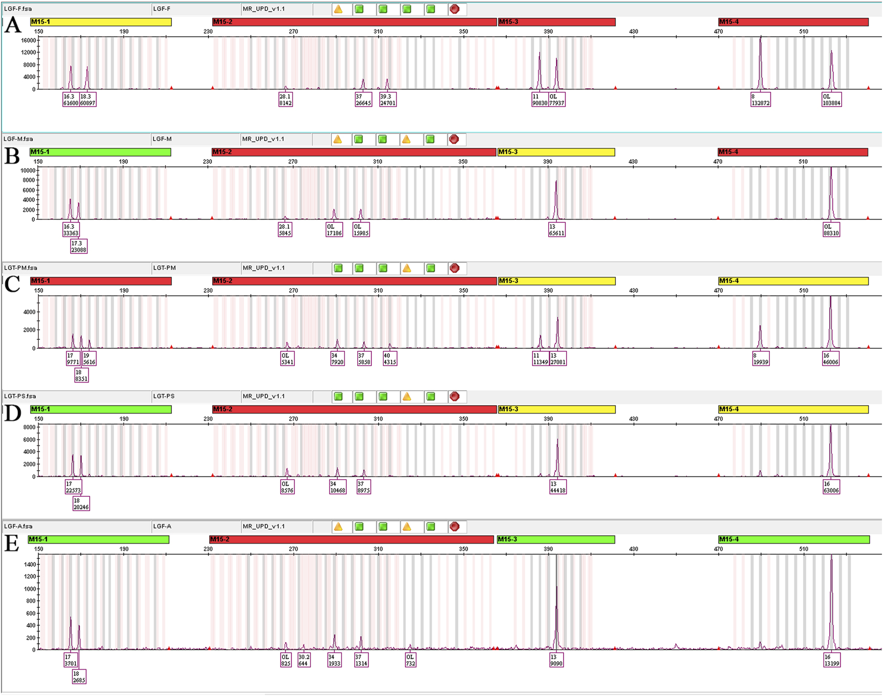 STR linkage analysis results. (A) Paternal STR analysis, M15-1 (17,19), M15-2 (37,40), M15-3 (11,13), M15-4 (8,16). (B) Maternal STR analysis, M15-1 (17,18), M15-2 (34,37), M15-3 (13), M15-4 (16). (C) Placenta ABCDE mix STR analysis, M15-1 (17,18,19), M15-2 (34,37,40), M15-3 (11,13), M15-4 (8,16). These confirmed mosaic T15 as of maternal origin in the maternal surface of the placenta. (D) Placenta abcde mix STR analysis, M15-1 (17,18), M15-2 (34,37), M15-3 (13), M15-4 (16); all four STR loci genotypes were fully consistent with maternal origin, with one locus exhibiting biallelic signals. These confirmed maternal hetUPD in the fetal surface of the placenta. (E) Amniotic fluid STR analysis, M15-1 (17,18), M15-2 (34,37), M15-3 (13), M15-4 (16); all four STR loci genotypes were fully consistent with maternal origin, with one locus exhibiting biallelic signals. These confirmed maternal hetUPD in the fetus.