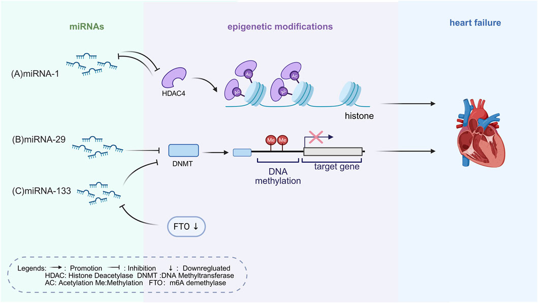 Figure 1. Epigenetic Mechanisms of miRNAs Regulation in HF. (A) MiR-1 targets HDAC4, blocking histone deacetylation to inhibit cardiac hypertrophy and alleviate HF. HDAC4 also negatively regulates the transcription of miR-1. (B) MiR-29b targets DNMT3a, blocking abnormal collagen gene methylation and inhibiting myocardial fibrosis. (C) MiR-133 targets DNMT3b to inhibit myocardial hypertrophy. FTO downregulation alters the function of miR-133a through m6A modification, weakening its ability to restrain myocardial hypertrophy and preserve cardiac function. The figure is created in https://BioRender.com.