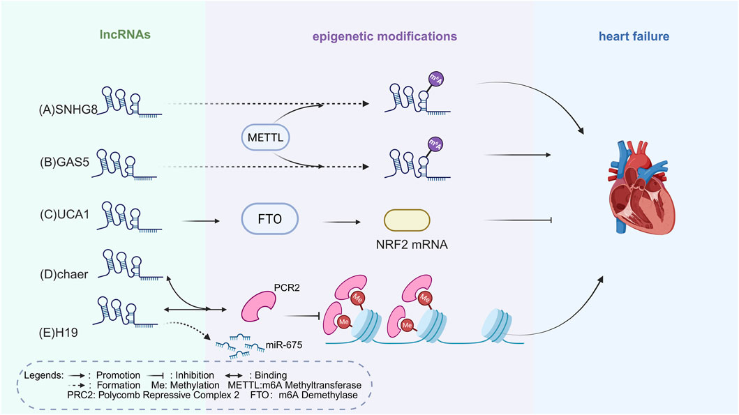 Figure 2. Epigenetic Mechanisms of lncRNAs Regulation in HF. (A) METTL3 enhances m6A levels on lncRNA SNHG8, which in turn exacerbates oxidative stress and injury, thereby driving the onset and progression of heart failure post-myocardial infarction. (B) METTL3 exacerbates myocardial fibrosis by enhancing the m6A modification of lncRNA GAS5, ultimately contributing to HF. (C) LncRNA UCA1 upregulates the expression of the demethylase FTO, thereby enhancing NRF2 mRNA expression, protecting cardiomyocytes from oxidative stress, and delaying the progression of HF. (D) LncRNA chaer directly binds with PRC2 to inhibit histone methylation on hypertrophic gene promoters, promoting cardiac hypertrophy and contributing to HF. (E) LncRNA H19 binds to PRC2, resulting in the demethylation of hypertrophic and collagen genes, thus promoting myocardial hypertrophy and fibrosis, and contributing to HF. H19 also encodes miR-675, which indirectly inhibits myocardial hypertrophy. The figure is created in https://BioRender.com.