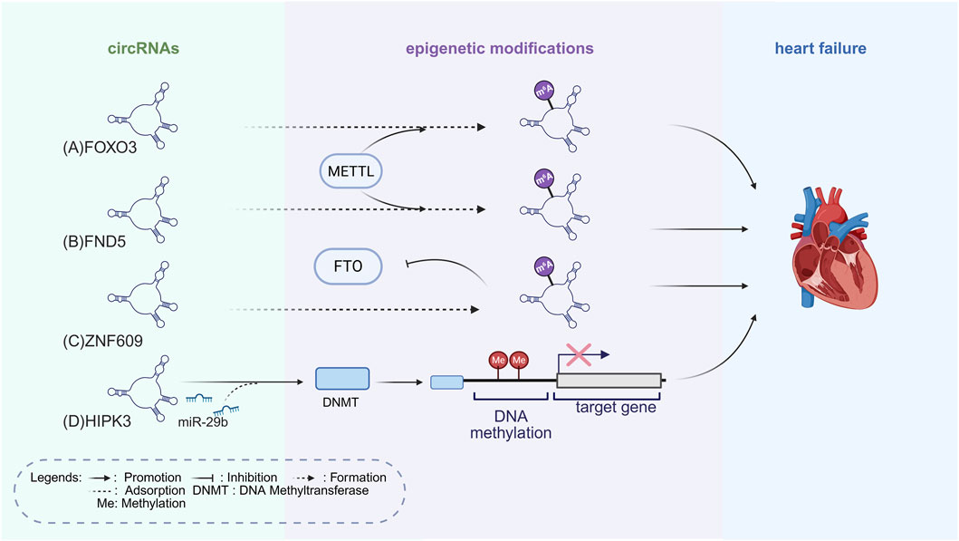 Figure 3. Epigenetic Mechanisms of circRNAs Regulation in HF. (A) CircRNA FOXO3 undergoes m6A modification mediated by METTL3, which enhances its stability and promotes myocardial apoptosis, thereby accelerating HF progression. (B) M6A-modified circRNA FND5, mediated by METTL3, regulates oxidative stress in cardiomyocytes and accelerates HF progression. (C) CircRNA ZNF609 is stabilized by m6A modification, and its accumulation suppresses FTO, maintaining elevated m6A levels that exacerbate cardiomyocyte injury and HF progression. (D) CircRNA HIPK3 adsorbs miR-29b-3p, relieving its suppression of DNMT3a, increasing DNA methylation levels, activating cardiac fibroblasts, exacerbating cardiac fibrosis, and worsening heart failure. The figure is created in https://BioRender.com.