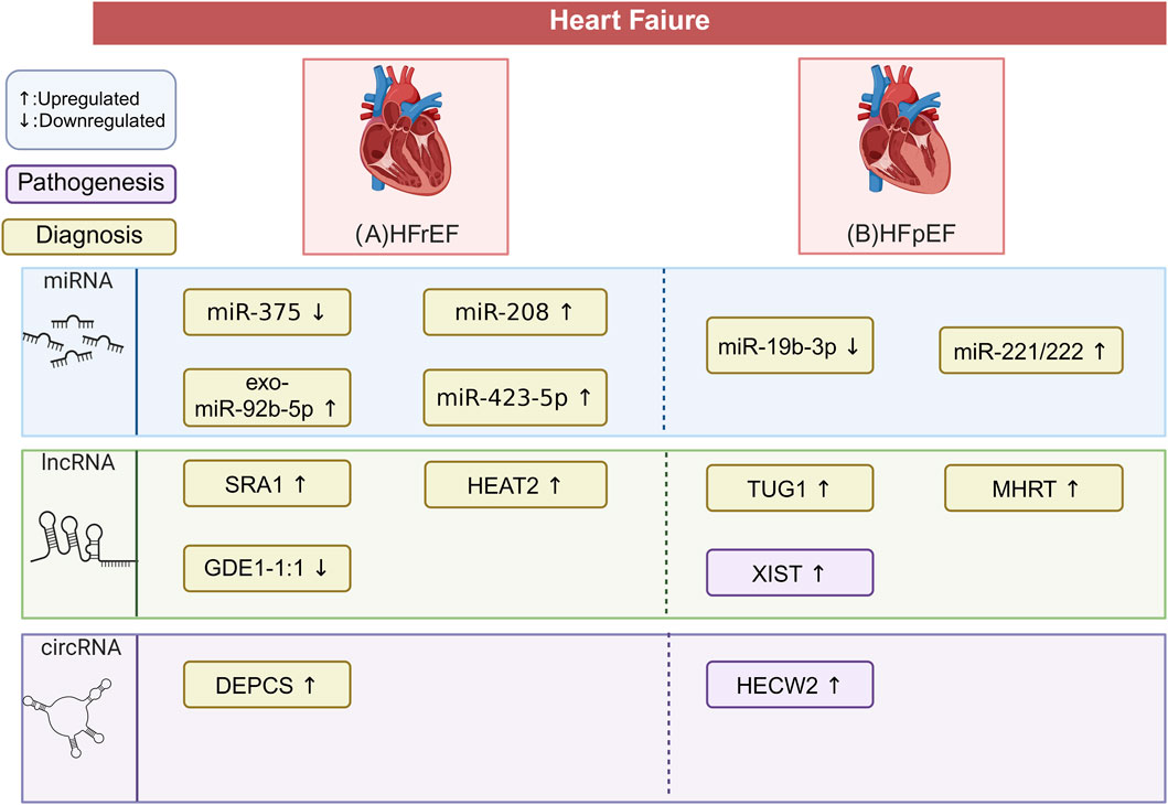 Figure 4. Differential ncRNA Expression in HF Types. This figure outlines the characteristic ncRNAs signatures across in patients with different types of HF. The pathogenesis and diagnoses depicted are all related to heart failure. The potential biomarkers mentioned require validation through large-scale, multi-center clinical trials. This does not imply that these biomarkers are without impact on the disease pathogenesis. (A) In HFrEF, miR-375 and lncRNA GDE1-1:1 are downregulated, while miR-208, miR-423-5p, exo-miR-92b-5p, lncRNA SRA1, lncRNA HEAT2, and circRNA DEPCS are upregulated. These molecules are potential biomarkers for HFrEF diagnosis. (B) In HFpEF, miR-19b-3p is downregulated, while miR-222/221, lncRNA TUG1, lncRNA MHRT, and circRNA HECW2 are upregulated. These molecules serve as potential biomarkers for HFpEF, with lncRNA XIST and circRNA HECW2 linked to profibrotic and inflammatory pathways. The figure is created in https://BioRender.com.