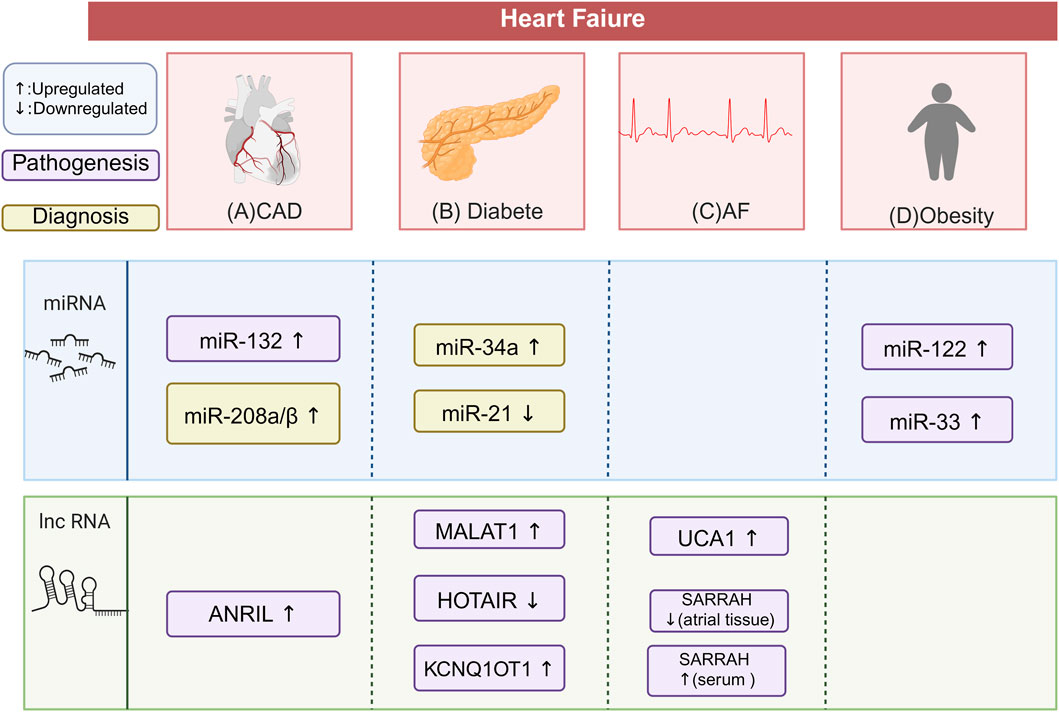 Figure 5. Differential ncRNA Expression in HF Comorbidities and Complications. This figure illustrates the characteristic ncRNA signatures in patients with HF and its comorbidities and complication. The potential biomarkers highlighted need to be validated through large-scale, multi-center clinical trials. This does not suggest that these biomarkers are irrelevant to the disease process. (A) In HF patients with CAD, miR-132 and lncRNA ANRIL are upregulated, contributing to the pathogenesis of CAD. miR-208a/β is also upregulated, helping diagnose myocardial injury alongside troponin. (B) In HF patients with diabetes, miR-34a is upregulated and miR-21 is downregulated, both serving as biomarkers for HFrEF. lncRNA MALAT1 is upregulated, increasing myocardial apoptosis and fibrosis. LncRNA KCNQ1OT1 is also upregulated, promoting cardiomyocyte pyroptosis and fibrosis. lncRNA HOTAIR is downregulated, promoting cardiac oxidative stress. (C) In HF patients with AF, lncRNA UCA1 is upregulated, promoting myocardial hypertrophy. lncRNA SARRAH is downregulated in atrial tissue but upregulated in serum, linked to resistance to oxidative stress and ischemic injury. (D) In HF patients with obesity, miR-33 and miR-122 are both upregulate. miR-122 promotes cardiac hypertrophy and fibrosis. miR-33 Participates in cardiovascular remodeling. The figure is created in https://BioRender.com.
