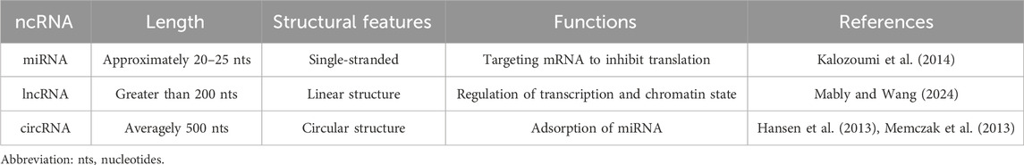 Studies on the link between HFmrEF and ncRNAs are still very limited (Savarese et al., 2022). Most reports focus on HFrEF and HFpEF, while HFmrEF is usually treated as an “intermediate phenotype” in comparative studies. In one analysis of transcriptomic data from patients with heart failure, HFmrEF was described as lying between HFpEF and HFrEF, with an ncRNA profile that may show transitional traits (Garcia-Padilla et al., 2022). So far, however, no independent and systematic research has been carried out in HFmrEF patients. Although ncRNAs are regarded as important factors in the development of heart failure, the molecular characteristics of HFmrEF remain unclear and need further confirmation through primary studies (Jalink et al., 2023).