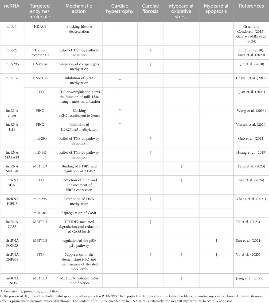 DNA methylation, the addition of a methyl group to cytosine at the 5-position, is a key epigenetic modification that regulates gene expression and contributes to pathological processes in HF, including hypertrophy and fibrosis (Liu and Tang, 2019). In HF animal models, genes such as GATA4 and MMP9 display marked changes in DNA methylation (Ho et al., 2024). These alterations contribute to the progression of ventricular remodeling. DNA methylation is crucial in the initiation and progression of myocardial hypertrophy and fibrosis. Abnormal DNA methylation of genes related to fibrosis, hypertrophy, and inflammation can drive maladaptive remodeling of the myocardium, a key precursor to HF. Abnormal expression of DNA methyltransferases (DNMTs), such as DNMT1 and DNMT3a, has been associated with HF, with changes in enzyme activity driving disease progression (Wu et al., 2020). NcRNAs can affect DNA methylation by regulating DNMT expression, thus altering gene activity and promoting myocardial fibrosis and hypertrophy. Consequently, inhibiting DNMTs could offer a potential therapeutic strategy to reverse myocardial injury (Garitano et al., 2025). However, substantial clinical evidence is still needed to establish their efficacy and safety (Garitano et al., 2025).