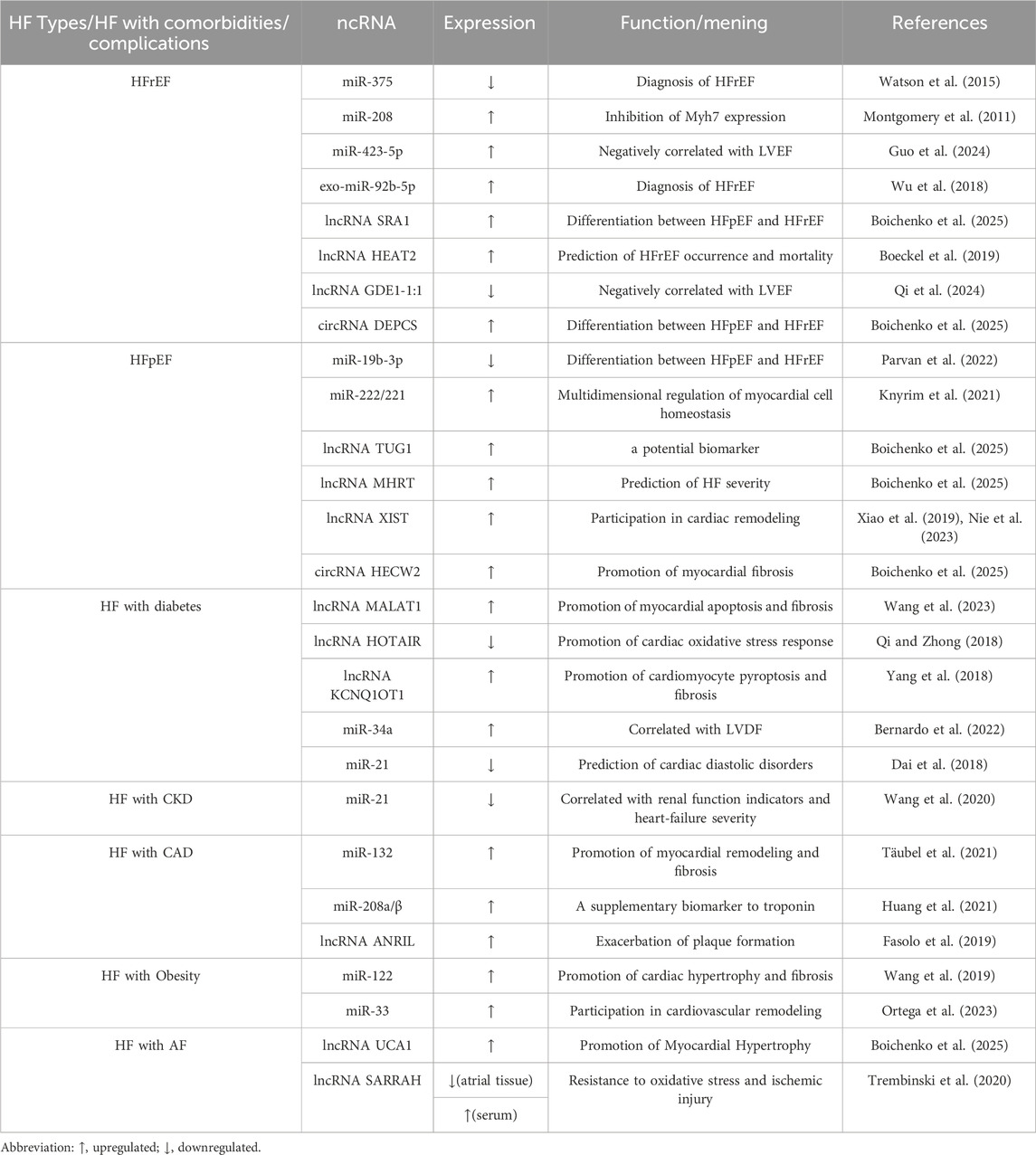 Obesity, hypertension, and COPD are likewise prevalent among patients with HF and exert a substantial influence on disease progression. In obesity, metabolic dysregulation is accompanied by abnormal ncRNA expression. For instance, miR-122 is elevated in obese states and, through exosomal transfer, contributes to myocardial hypertrophy and fibrosis, while miR-33, an essential regulator of lipid metabolism, is implicated in cardiovascular remodeling (Wang et al., 2019; Ortega et al., 2023). In hypertension, alterations in the expression and function of vascular- and myocardium-enriched ncRNAs have been reported; however, their precise contribution to heart failure progression remains to be further investigated (Zhang, 2009; Dong et al., 2010). In COPD, ncRNAs associated with inflammation and oxidative stress, including miR-21 and miR-146a, have been implicated in disease mechanisms; however, direct evidence from human studies on HF–COPD comorbidity remains scarce (Sato et al., 2010; Sai et al., 2024). Overall, compared with diabetes, coronary artery disease, and chronic kidney disease, mechanistic research into these comorbidities in the context of ncRNA regulation remains underdeveloped, underscoring the need for further investigation to refine HF phenotypic stratification and mechanistic understanding (Rech et al., 2018).
