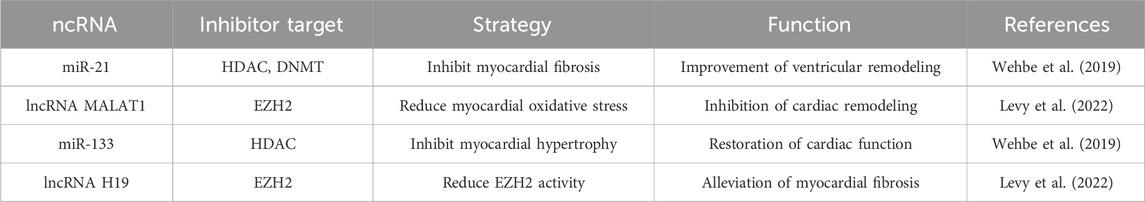 To enhance therapeutic specificity, combinatorial strategies integrating low-dose epigenetic drugs with targeted ncRNA interventions are gaining momentum (Song et al., 2025). For example, miR-133 mimics combined with HDAC4 inhibitors synergistically downregulate hypertrophic gene expression and reverse cardiac remodeling (Wehbe et al., 2019). Similarly, co-administration of miR-21 antagomirs with Vorinostat or Decitabine inhibits miR-21 activity, reduces fibrosis, and improves ventricular structure and function (Gorica et al., 2022).