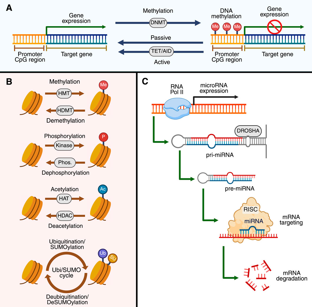 Figure 1. Molecular mechanism in epigenetics. In (A), the processes of DNA methylation and demethylation control gene expression at CpG-rich promoter regions are shown. DNA methyltransferases (DNMTs) mediate the addition of methyl groups (Me) to cytosines, leading to gene silencing. Passive demethylation occurs during DNA replication, whereas active demethylation is catalyzed by the ten-eleven translocation (TET) enzymes and activation-induced cytidine deaminase (AID). In (B), the post-translational modifications of histones are shown. Histone methyltransferases (HMTs) and histone demethylases (HDMTs) add and remove methyl groups (Me), respectively. Likewise, histones can also be phosphorylated (P) by kinases, while phosphorylation is removed by phosphatases (Phos.). Similarly, acetylation (Ac) of histones occurs through histone acetyltransferases (HATs) and is deacetylated by histone deacetylases (HDACs). Finally, histones can also undergo ubiquitination and SUMOylation (Ub/SUMO). In (C), the mechanism of non-coding RNA expression is illustrated. DROSHA first processes primary microRNAs (pri-miRNAs) into precursor microRNAs (pre-miRNAs), which are then loaded onto RISC. In the RISC, mature miRNAs direct the complex to specific mRNAs, resulting in the degradation or translational inhibition of these mRNAs. The image was created by BioRender.com.