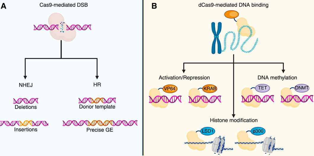 Figure 2. CRISPR/Cas and genome and epigenome editing. (A) CRISPR/Cas9 genome editing uses a catalytically active Cas9 that induces double-strand breaks (DSBs) at target loci. DSB repair by NHEJ may introduce small indels, while, in the presence of a donor DNA template, HR facilitates targeted genome modification. (B) CRISPR/Cas9-based epigenome editing (GE) utilizes a catalytically dead Cas9 (dCas9), which allows for the targeted recruitment of effector domains without inducing DNA cleavage. dCas9 fused to transcriptional activators (e.g., VP64) or repressors (e.g., KRAB) modulates gene expression. Joining with ten-eleven translocation enzymes (TET) or DNA methyltransferases (DNMT) allows locus-specific demethylation or methylation of the DNA. Histone modifications can also be mediated by dCas9-fused effectors, such as lysine-specific demethylase 1 (LSD1) or histone acetyltransferase p300. The image was created by BioRender.com.