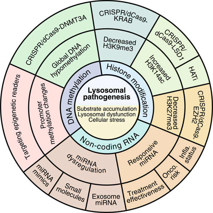 Novel studies have addressed the use of exosomes for transporting miRNA in non-LSD (Huang et al., 2023a), which may also constitute a promising alternative in the treatment of LSDs. Indeed, the large number of FDA-approved molecules may accelerate the implementation of epigenetic drugs into the classical approaches used in LSDs. Likewise, the latest advances in the CRISPR/Cas9 system, a revolutionary tool for editing the epigenome, may offer a novel and exciting strategy for restoring epigenetic disturbances in LSDs, thereby increasing the treatment options available.