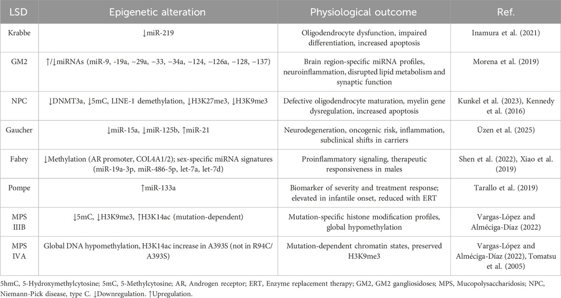 Resulting substrate accumulation leads to disturbances in cell homeostasis, which ultimately promote pro-oxidant, pro-inflammatory, and pro-apoptotic profiles (Leal et al., 2022). Beyond lysosomal substrate accumulation, as the primary cause of the LSDs, some studies suggest that epigenetic dysregulation may contribute to LSD pathogenesis (Hassan et al., 2017). For instance, aberrant DNA methylation, histone modification patterns, and disrupted non-coding RNA expression have been documented in LSDs (Fu et al., 2022; Shen et al., 2022; Morena et al., 2019; Vargas-López and Alméciga-Díaz, 2022; Xiao et al., 2019; Kunkel et al., 2023; Üzen et al., 2025; Tarallo et al., 2019; Tomatsu et al., 2005; Dasgu et al., 2015), further supporting their role in the pathomechanisms of these disorders.