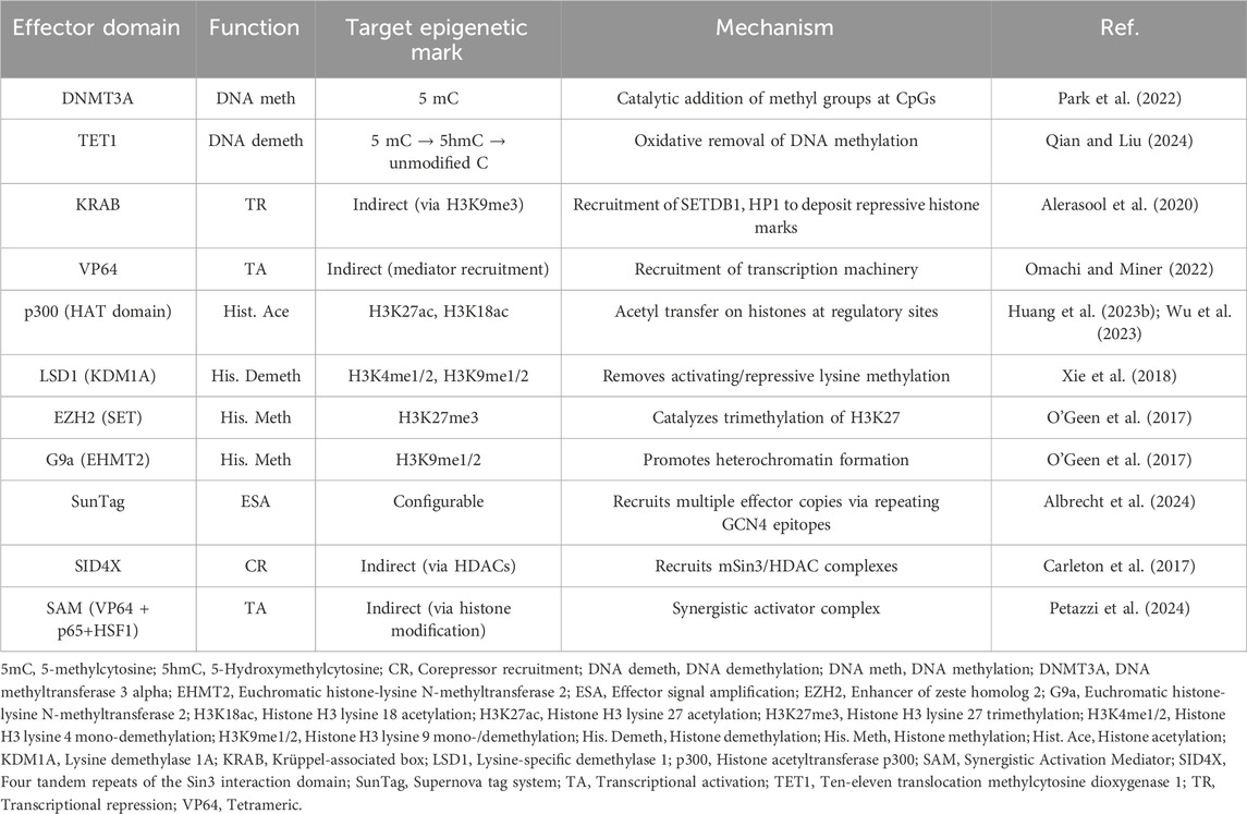 The CRISPR/Cas9 system includes a single guide RNA (sgRNA) that binds to a desired DNA sequence and recruits the Cas9 protein. Interaction of Cas9 with a protospacer adjacent motif (PAM) in DNA precedes sgRNA-mediated DNA binding (Jiang and Doudna, 2017; Jinek et al., 2012). Moreover, Cas9 introduces a double-strand break (DSB) in the DNA, ultimately promoting the activation of the DSB repair. Cas9 has two nuclease domains (HNH and RuvC) that generate the DSBs (Jiang and Doudna, 2017). If a donor template is co-delivered into the nucleus, homologous recombination takes place, and exogenous DNA information is inserted (knock-in). Instead, when no donor is available, the non-homologous end-joining (NHEJ) pathway is activated, introducing random insertions and deletions (indels), which can lead to knockouts (Leal et al., 2024; Chen et al., 2024). Interestingly, novel approaches have combined the extraordinary ability of CRISPR/Cas9 with the use of enzymes capable of modifying epigenetic signatures, resulting in a novel approach termed CRISPR/Cas9-based epigenome editing (EE) (Villiger et al., 2024; Fadul et al., 2023). This innovative approach utilizes the recognizing and binding properties of the CRISPR/Cas9 system while avoiding Cas9-mediated DSBs by employing a catalytically inactive Cas9 enzyme, also known as dead Cas9 (dCas9) (Cai et al., 2023). dCas9 carries two mutations in the HNH (H840A) and RuvC (D10A) domains that prevent DSBs within the DNA (Liu et al., 2020; Whinn et al., 2019). Along with dCas9, the CRISPR/Cas9-based EE leverages epigenetic effectors that can inhibit or activate gene transcription (Figure 2) (Koonin et al., 2023; Sar and Dalai, 2021). Table 2 summarizes common effectors used in CRISPR/Cas-based EE.
