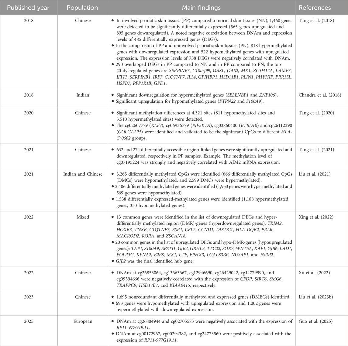 Psoriasis is a chronic inflammatory disease that poses a huge economic and psychological burden on both individuals and society (Griffiths et al., 2021). The prevalence of psoriasis across different ethnic populations ranges from 0% to 2.1% in children and 0.91%–8.5% in adults (Parisi et al., 2013). The pathogenesis of psoriasis has not been fully clarified, and it is believed that the occurrence of psoriasis is due to genetic (Sheng et al., 2014; Yin et al., 2015; Zuo et al., 2015; Zhou et al., 2016a), immunological (Huang et al., 2021; Huang et al., 2025), epigenetic (Zhou et al., 2016b; Zhou et al., 2016c), and environmental factors (Griffiths et al., 2021). With the development of biotechnology, research on psoriasis pathogenesis has focused on epigenetics. Epigenetics is the study of heritable changes in gene expression or cell phenotypes without altering the DNA sequence. Many epigenetic phenomena, such as DNA methylation (DNAm), genomic imprinting, maternal effects, gene silencing, nucleolar dominance, dormant transposon activation, and RNA editing, participate in the occurrence and development of diseases. Previous studies have shown evidence of anatomical location-dependent DNAm patterns in psoriatic lesions (Wu et al., 2019), an association between biological age and DNAm age (Shen et al., 2018), consensus clustering based on DNAm data (Zhou et al., 2018), DNAm of some genes mediating risk variation for psoriasis (Zhou et al., 2016c), and DNAm loci for psoriasis identified by epigenome-wide association analysis (Zhou et al., 2016b). In recent years, an increasing number of researchers have focused on the epigenetic pathogenesis of psoriasis and achieved many meaningful results. Here, we review and summarize the recent progress on DNAm in psoriasis.