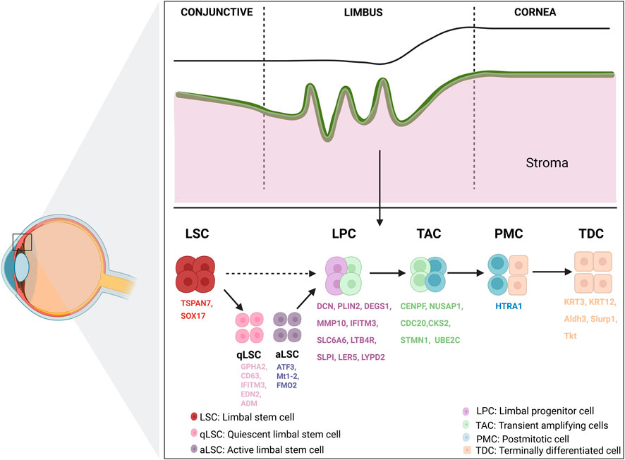The scRNA-seq results of qLSCs and aLSCs further reveal the changes in makers during the transitional phase. Applying in situ hybridization probes to label mouse conjunctival and corneal basal and suprabasal cells, respectively, Altshuler et al. (2021) found that Gpha2 staining could divide the corneal limbus into qLSCs and aLSCs, which were labeled by Gpha2, Cd63, Ifitm3, and Atf3, Mt1-2, respectively. Song et al. (2022) applied scRNA-seq to identify heterogeneous cell populations at the corneal limbus under normal homeostasis and following injury. Their investigation unveiled “putative quiescent LSCs” (biomarkers: Edn2 and Adm) and “putative active LSCs” (biomarkers: Fmo2). They also identified diverse LPC subtypes through distinct biomarkers such as Ler5 and Lypd2. Additionally, they noted a progressive increase in the expression of biomarkers associated with mature corneal epithelium (Aldh3, Slurp1, and Tkt) during corneal epithelial maturation.