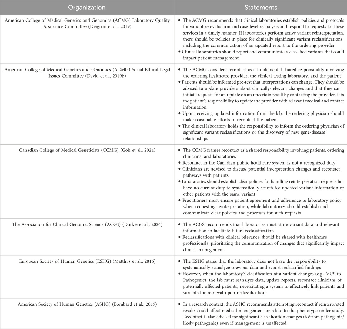Reanalysis and reinterpretation of clinical genetic test results are guided by recommendations from professional societies, including the American College of Medical Genetics and Genomics (ACMG), the Canadian College of Medical Geneticists (CCMG), and the Association for Clinical Genomic Science (ACGS). While the organizations emphasize an ethical importance, there remains a lack of clarity and discordance on the responsibilities for reinterpretation. The key guidelines and position statements are summarized in Table 1.