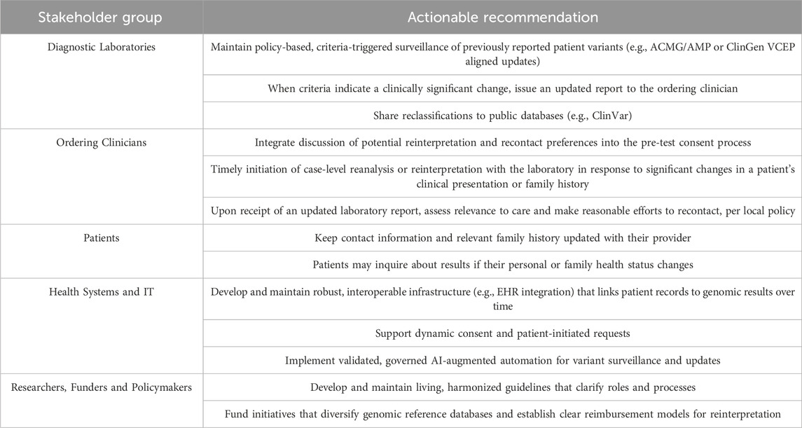 The stakeholder discordance, conflicting expectations, and operational gaps described above demonstrate that while a shared responsibility framework is broadly endorsed in principle, it remains to be realized. To operationalize a shared responsibility model, roles must align with expertise. Our proposed framework clarifies this by distinguishing between proactive, variant-level reinterpretation initiated by diagnostic laboratories and reactive, case-level reanalysis initiated by clinicians in response to new patient information. Table 2 outlines these responsibilities, designed to support the integration of reinterpretation as a standard of care without asserting a new legal duty.