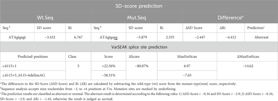The SD-Score online website (https://www.med.nagoya-u.ac.jp/neurogenetics/SD_Score/sd_score.html) provides prediction results for SD-Score and information contents (Ri). The SD-Score was utilized to predict the potential effects of 5′splice site (5′ss) mutations by using a common logarithm calculated from the frequency of a specific 5′ss in the human genome. This tool accepts both wild-type and mutant-type 5′ss sequences spanning nine nucleotides from exon −3 to intron +6 positions and returns differences in the SD-Score (ΔSD-Score) with a sensitivity of 97.1% and specificity of 94.7%, respectively (Sahashi et al., 2007; Ohno et al., 2018). Subsequently, the potential impact on authentic splice sites was further assessed using the varSEAK online site (https://varseak.bio/). The visualized splicing prediction software, Rare Disease Data Center (RDDC) RNA splicer (https://rddc.tsinghua-gd.org/), was used to further explore the possible splicing patterns. This AI model tool predicts alternative splicing sites within mRNA sequences by learning canonical splicing patterns (Jaganathan et al., 2019; Zhang et al., 2023). Three-dimensional models of the protein were established using the PyMol software to observe structural changes induced by the mutation and to predict potential factors contributing to these alterations.