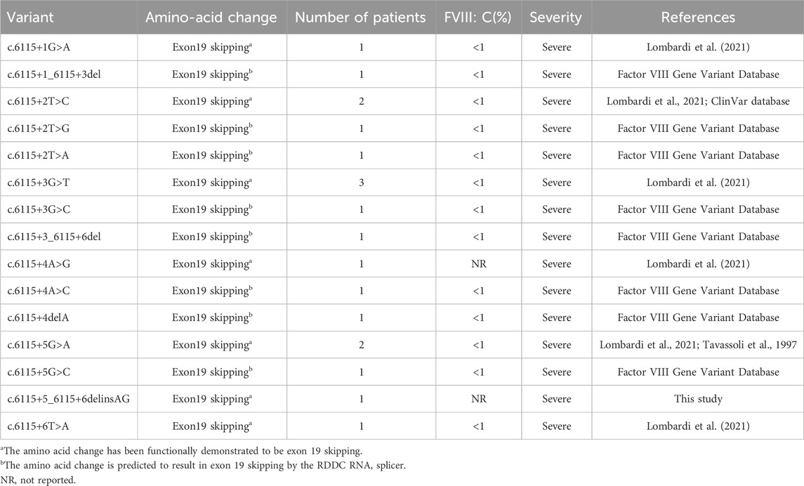 Table 2. Summary of patients with c.6115+1_ 6115+6 variants in intron 19 of the F8 gene.