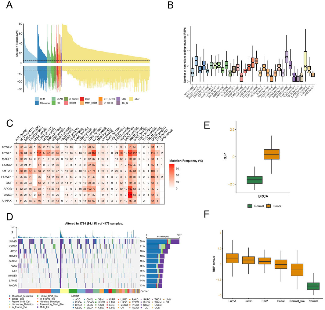 Figure 1. A distinct landscape of RNA-binding proteins (RBPs) in pan-cancer. (A) Histogram illustrates the occurrence of somatic copy number changes (deletions or amplifications) in breast cancer for all identified RBPs, categorized based on their RNA-binding domains using Pfam nomenclature. Data were obtained from the breast cancer TCGA database through UCSC XENA. (B) The count of non-silent coding-mutated RBPs in each sample across the 33 cancer types. The data underwent preprocessing involving log2-based conversion. (C) Mutation frequency of top 10 RBP-responsive genes. Numbers indicate the count of samples where the specific mutated gene is present in a particular cancer type. “0” signifies the absence of mutations in the coding region of the gene, while the absence of any number denotes no mutations in any area of the gene. (D) Oncoplot illustrating the distribution of mutations in RBP-responsive genes and categorization based on SNV types. (E) The different RBP potential index between tumor and normal tissues in breast cancer. (F) The different RBP potential index among different molecular subtypes of breast cancer.