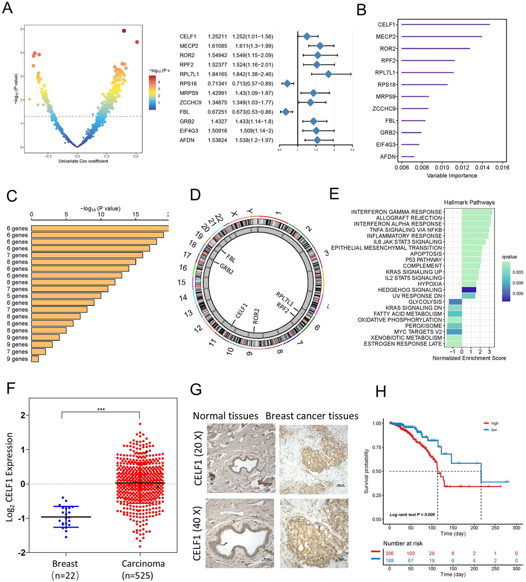 Figure 2. Identification of candidate RBP-responsive genes, along with CELF1 upregulation in breast cancer within a specific landscape of RBPs. (A) Left, volcano plot of univariable Cox analysis for RBPs in TCGA-BRCA [log2(HR) vs. −log10(P), BH adjusted]. Right, forest plot for the 12 top-ranked RBPs (HR with 95% CI; Wald test P). (B) A total of 12 genes were selected through random survival forest analysis. (C) Conducting Kaplan–Meier analysis on 212–1 = 4,095 combinations, the top 20 signatures were organized according to their p-values. Among these signatures, six genes were selected for having a relatively large −log10 p-value and a small gene count. (D) The location of CNV alteration of six selected RBPs on 23 chromosomes using the TCGA-BRCA cohort. (E) Enrichment of Hallmark gene sets for genes that decrease in importance as CELF1 gene effect levels increase in a DepMap analysis. (F) Expression of CELF1 in TCGA-BRCA tumors vs. adjacent normal (UCSC Xena; overall comparison). The median and interquartile range are depicted by black lines in each group ***p < 0.001. (G) Immunohistochemical technique was employed to assess the expression levels of CELF1 in both breast carcinomas and adjacent noncancerous tissues. (H) Kaplan–Meier analysis on overall survival among luminal A breast cancer patients, categorizing samples into high- and low-CELF1 expression groups, with p-values derived from log-rank testing.
