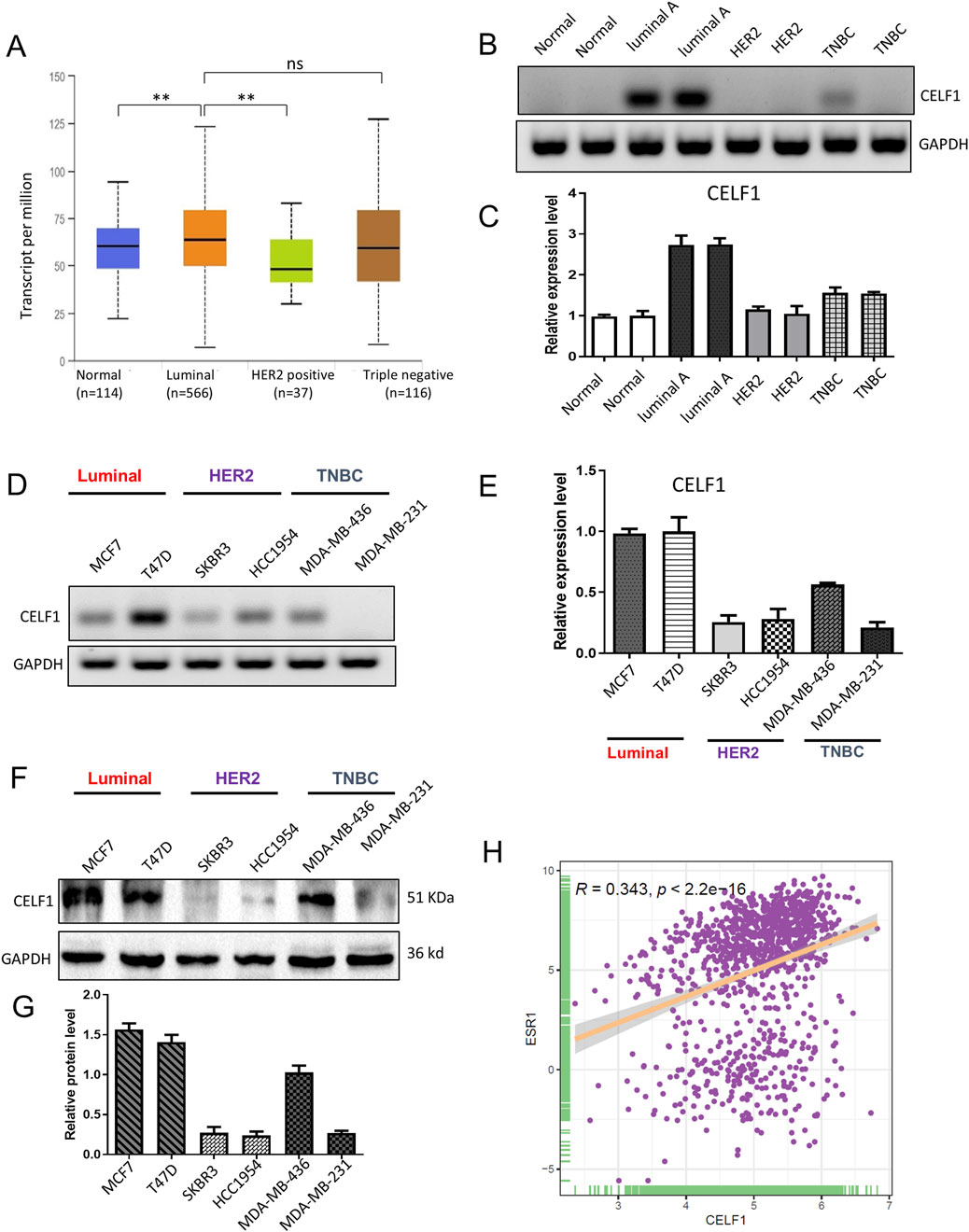 Figure 3. CELF1 is overexpressed in luminal A breast cancer and lowly expressed in triple-negative breast cancer cell line. (A) Subtype-stratified CELF1 expression based on TCGA-BRCA via UALCAN (luminal, HER2-enriched, and TNBC; subtype annotation available in the portal). Black lines in each group indicate a median with an interquartile range. **P < 0.01. ns, not significant. (B) Endpoint RT-PCR gels showing CELF1 and GAPDH in adjacent normal tissues (Normal) and tumor subtypes (Luminal A, HER2-enriched, and TNBC). Representative images are shown. (C) Quantitative real-time PCR (qRT-PCR) of CELF1 mRNA in the same tissue groups, normalized to GAPDH and expressed relative to the normal group. Data are shown as mean ± SEM from three independent experiments. (D) Endpoint RT-PCR gels for CELF1 and GAPDH in luminal cell lines (MCF7 and T47D), HER2 cell lines (SKBR3 and HCC1954), and TNBC cell lines (MDA-MB-436 and MDA-MB-231). Representative images are shown. (E) qRT-PCR measurement of CELF1 mRNA in the indicated cell lines, normalized to GAPDH and expressed relative to MCF7. Data are shown as mean ± SEM from three independent experiments. (F,G) Western blot analysis was performed on CELF1 protein levels within subtypes of luminal, HER2, and TNBC; GAPDH acted as the loading control (F) Protein expression levels were quantified relative to GAPDH using densitometric analyses (G) Data are expressed as means ± SEM. (H) The correlation between CELF1 and ESR1 expressions **P < 0.01. Every circle signifies a distinct human breast carcinoma sample. Correlation analysis was performed using Gene Expression Profiling Interactive Analysis (Tang et al., 2017).