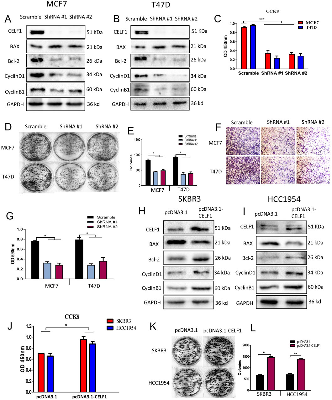 Figure 4. CELF1 regulates the proliferation, colony formation, migration, and invasion of breast cancer cells. (A,B) ShRNA-mediated silencing of CELF1, Bax, Bcl-2, cyclin D1, and cyclin B1 was analyzed using Western blotting in MCF7 cells (A) and T47D cells. (B) GAPDH acted as a loading control. For proteins CELF1, Bax, and Bcl-2, cropped lanes are obtained from the same gel (dividing lines between groups). Full uncropped blots are provided in Supplementary Figure file 2. (C) Knockdown of CELF1 in MCF7 and T47D cells; cell viability was assessed using CCK8 assays. Data are expressed as means ± SEM. ***P < 0.001. (D,E) Knockdown of CELF1 in MCF7 and T47D cells; cell growth was examined using plate assay (D) and the quantitative analysis (E), at a density of 500 cells/well for 14 days. Data are expressed as means ± SEM. *P < 0.05. (F,G) Knockdown of CELF1 in MCF7 and T47D cells; cell invasion was examined using the transwell assay (F) and the quantitative analysis (G). Data are expressed as means ± SEM. *P < 0.05. H, (I) Overexpression of CELF1 by transfection of the pcDNA3.1 vector and pcDNA3.1-CELF1 in SKBR3 (H) and HCC1954 cells (I); CELF1, Bax, Bcl-2, cyclin D1, and cyclin B1 protein levels were analyzed using Western blotting; GAPDH was used as a loading control. (J) Overexpression of CELF1 in SKBR3 and HCC1954 cells; cell viability was assessed using CCK8 assays. Data are expressed as means ± SEM. *P < 0.05. (K,L) Overexpression of CELF1 in SKBR3 and HCC1954 cells; cell growth was examined using the plate assay (K), and the quantitative analysis (L), at a density of 500 cells/well for 14 days. Data are expressed as means ± SEM. **P < 0.01.