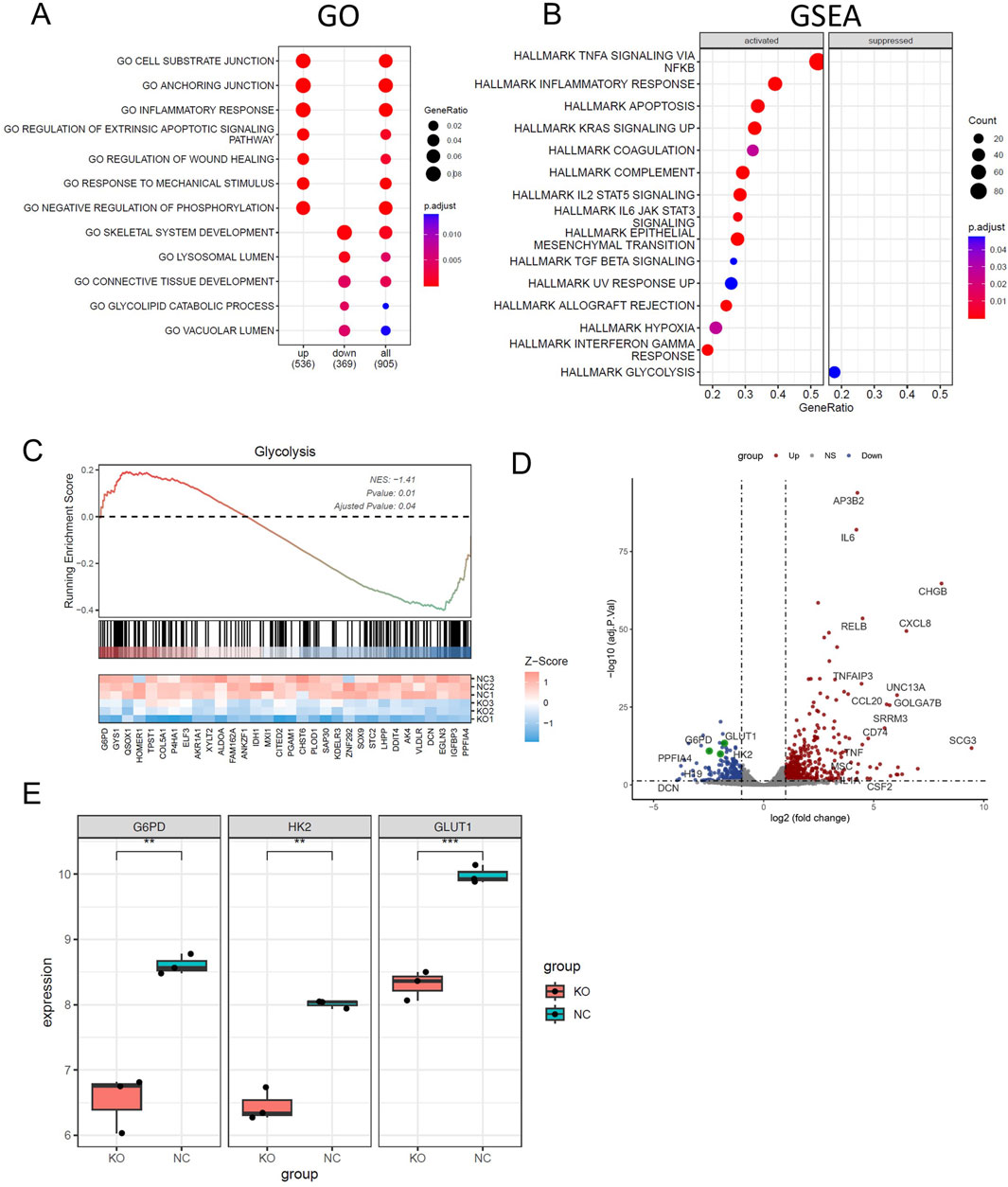 Figure 5. CELF1 promotes breast cancer cell aerobic glycolysis in vitro. (A) Enriched Gene Ontology (GO) terms of significantly differentially expressed genes between CELF1-knocked-out MCF7 cells and wild-type MCF7 cells. (B) GSEA shows the enriched hallmarks pathways between CELF1-knocked-out MCF7 cells and wild-type MCF7 cells. (C) GSEA shows the molecules that are significantly altered in the glycolytic pathway. (D) The volcano plot of differentially expressed genes between CELF1-knocked-out MCF7 cells and wild-type MCF7 cells. (E) Differential mRNA expressions of GLUT1, HK2, and G6PD in CELF1-knocked-out MCF7 cells and wild-type MCF7 cells.