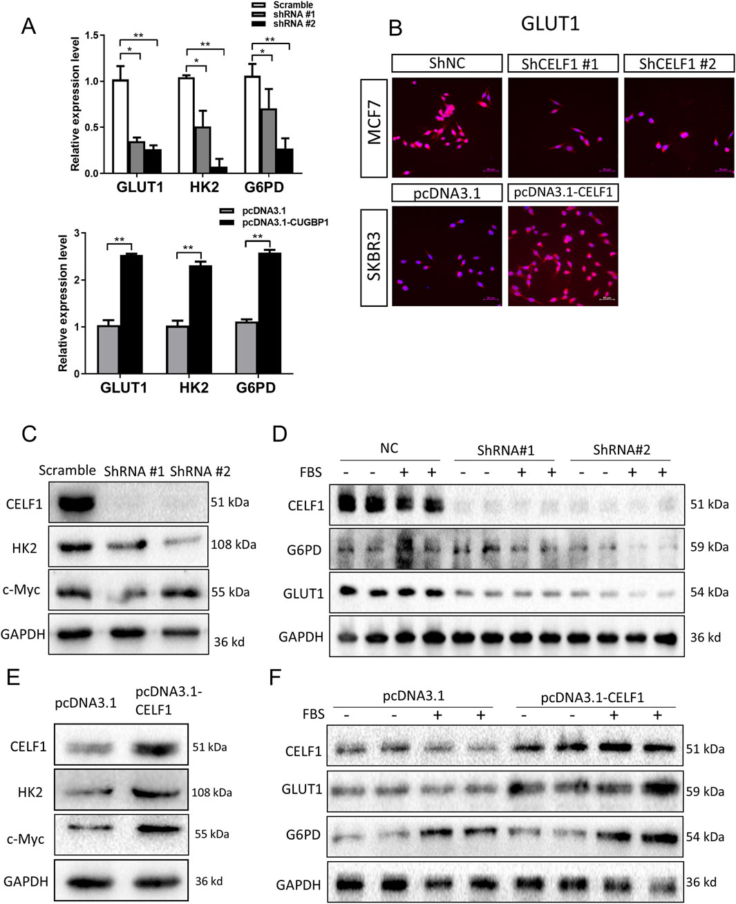 Figure 6. CELF1 governs aerobic glycolysis by regulating GLUT1 levels. (A) Relative RNA expressions of GLUT1 HK and G6PD in CELF1-KO MCF7 cells (upper) and CELF1-overexpressed SKBR3 cells (lower) measured using real-time PCR. Data are expressed as means ± SEM. *P < 0.05.**P < 0.01. ***P < 0.001. (B) Immunofluorescence of GLUT1 in CELF1-KO MCF7 cells and CELF1-overexpressed SKBR3 cells. Scale bar: 50 μm. (C,D) Protein levels of CELF1, HK, c-Myc, G6PD, and GLUT1 in MCF7 cells after the transfection of control and CELF1 shRNA were determined using Western blotting. Cell lysates were collected with or without pretreated 20% fetal bovine serum (FBS) for 4 h. GAPDH served as an internal control. (E,F). Protein levels of CELF1, HK, c-Myc, G6PD, and GLUT1 in SKBR3 cells after the transfection of the pcDNA3.1 and pcDNA3.1–CELF1 vectors were determined using Western blotting. Cell lysates were collected with or without pretreated 20% FBS for 4 h. GAPDH served as an internal control.