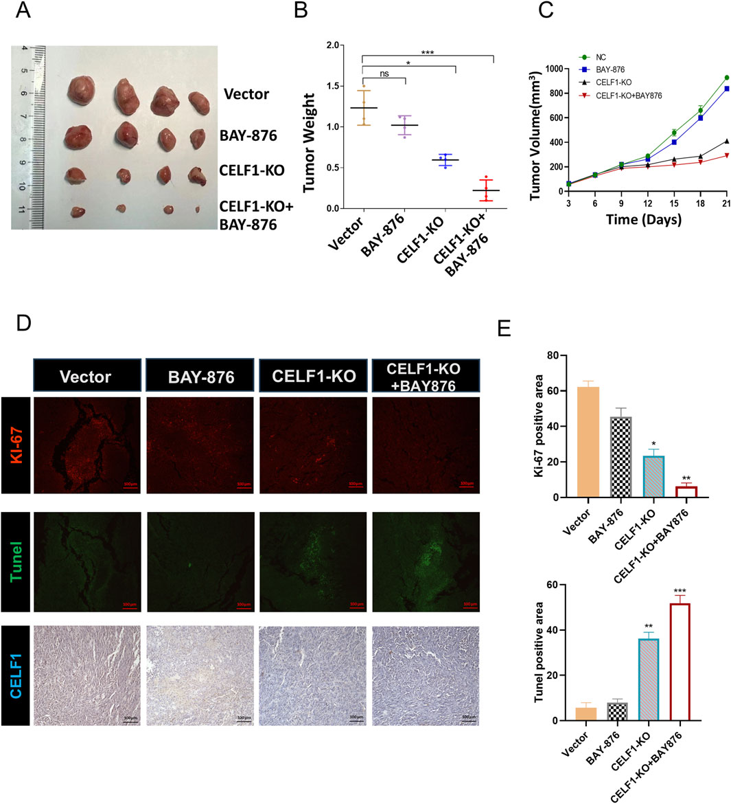 Figure 7. CELF1-KO combined with the GLUT1 inhibitor BAY876 inhibits the proliferation of breast cancer cells in vivo. (A) Nude mice were injected with CELF1-KO T47D cells to establish subcutaneous tumor models. The mice were orally administered BAY-876 for 3 consecutive days (once daily). The outcomes are visually represented as the images of the subcutaneous tumor tissues (A), tumor weights (B), and tumor volumes (C). F (3,12) = 40.89, *P < 0.05 and ***P < 0.001. (D,E). Immunofluorescence and IHC of Ki67, Tunel, and CELF1 in the control group, BAY-876 group, CELF1-KO group, and CELF1-KO combined with the BAY-876 group. Scale bars = 100 μm. (E) Statistical analysis of the data shown in the upper panel yielded F (3,12) = 188.7, and for the lower panel F (3,12) = 285.0 (*P < 0.05.**P < 0.01. ***P < 0.001).