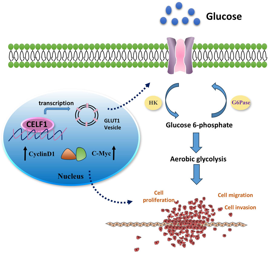 Figure 8. Mechanism diagram illustrating the involvement of CELF1 in aerobic glycolysis in breast cancer. It is well known that many aggressive tumors develop dysregulated metabolism; the glycolytic pathway was closely correlated to the vitality of tumors. Our transcriptomic analysis results suggest that CELF1 alterations impact the glycolysis process, and GLUT1 is the main molecule among all the volatile metabolites. Therefore, we focused on the genes related to aerobic glycolysis. As shown in Figure 8, the expression of GLUT1 is substantially decreased in the CELF1-knocked-out group, and so is the expression of key enzymes HK and G6PD in the aerobic glycolysis process (Figure 8). In addition, knockout of CELF1 affects the expression of cyclin D1 and c-Myc, suggesting that the occurrence, invasion, and metastasis processed are changed accordingly in the tumor tissues.