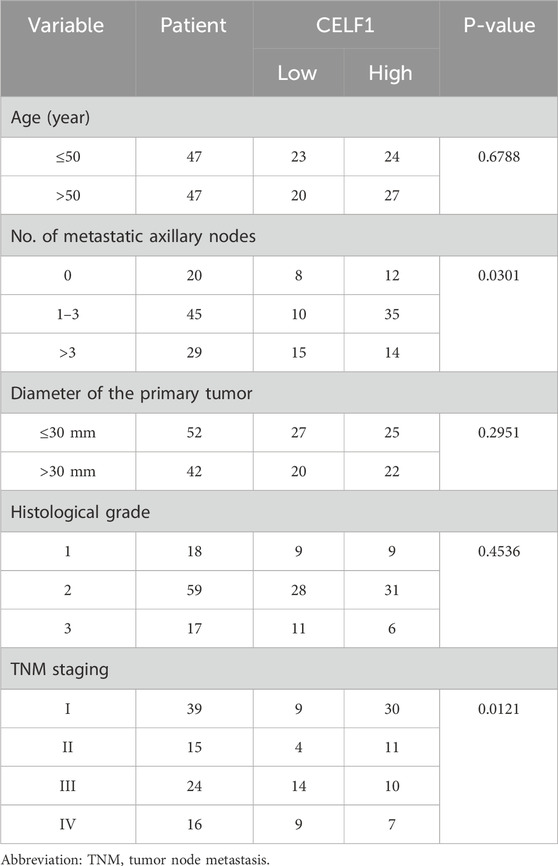 From January 2008 to January 2014, we collected 94 breast cancer specimens, along with paired adjacent non-cancerous breast tissue, through surgical resection at the Second Hospital of Dalian Medical University. Patients were excluded if they 1. had a history of other malignancies, 2. received neoadjuvant chemotherapy or radiotherapy, or 3. had incomplete clinical records. The study’s selection criteria included the following: 1. histopathological confirmation of ER-positive, PR-positive, and HER2-negative breast cancers, 2. post-operative analysis of at least 15 lymph nodes, 3. the ability to uniformly treat tumor samples with the CELF1 antibody, and 4. the presence of comprehensive medical records for each patient. Tissue samples were systematically randomized using a computer-generated sequence to ensure unbiased allocation for experimental analyses. Clinical data collection included patient age, menopausal status (pre-/post-menopausal), and standard pathological parameters. The study’s research protocol received ethical approval from the Ethics Committee of the Second Hospital of Dalian Medical University.