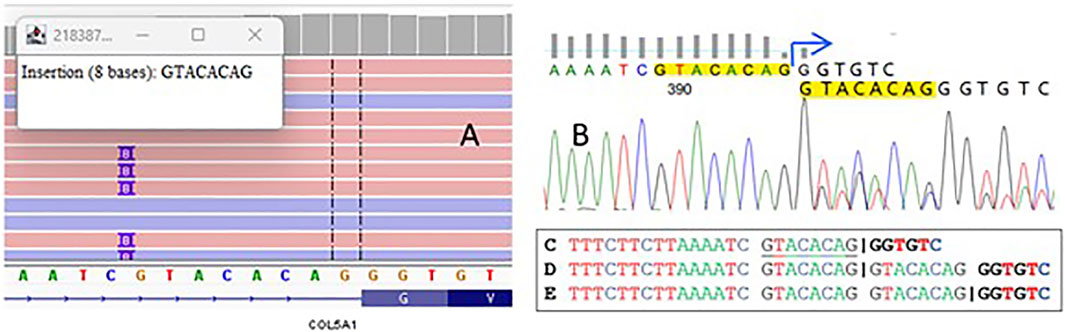 Figure 1. A visualization of sequencing reads that demonstrate an insertion of eight nucleotides in the splicing region of the COL5A1 gene (A). The electropherogram plot from Sanger sequencing confirms this variant (B). The splice site in the wild-type sequence is shown by the “|” symbol C, along with the potential impact of the duplication on the positioning of splice sites in the mutant allele D,E.