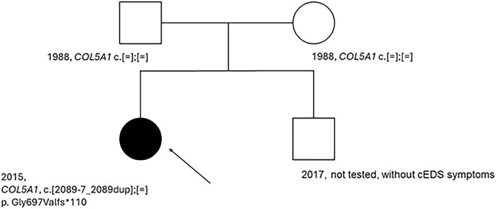 Testing for the variant COL5A1 c.2089-7_2089dup was conducted on the patient and her parents. The parents were asymptomatic of cEDS, possibly not carriers of the COL5A1 alteration. The test was not performed on the younger brother, who did not show cEDS symptoms (Figure 2).